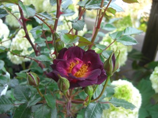 今朝ふとみたら、咲いていました。シックな色です。イギリス・ワーナーの2011年作出のツルバラ、ダークチェリーパイです。