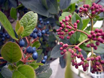 葉っぱの広がりや質感がとても上品で、シェードガーデンにおすすめのビバーナム。ガマズミの仲間で、日本でも庭木として親しまれています。ティヌスは、春に咲く白い花のあとに、深い青色の実も楽しめます。常緑で、強い西日が当たらなければ、日向から日陰まで大丈夫。丈夫です。