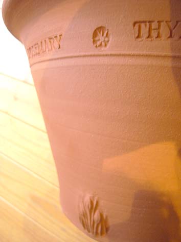 鉢の側面の刻印がさりげなくてかわいらしいです。ハーブの名前や、小さな植物の飾りが、ちょこんとついています。