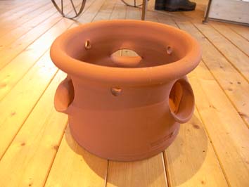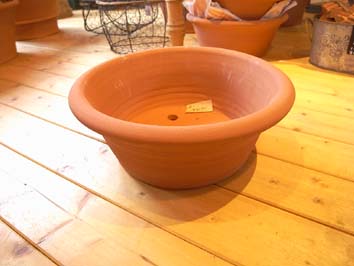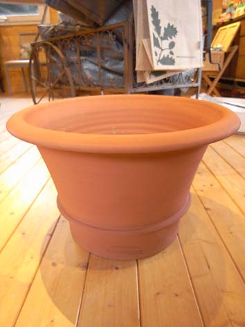シンプルなトスカーナ風テラコッタ鉢。たっぷり土が入ります。上部の口のところが反り返っていて、とても持ちやすいです。