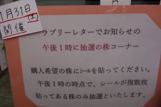 先週雪のため開催できなかった午後1時抽選のコーナー!31日(土)開催予定です。多少雪まじりの寒い1日になりそうですが、暖かくしてお出かけくださいませ。