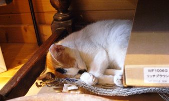 にゃんこも、今日は店じまい、棚の下でぐーぐー寝ています。