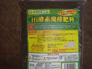 鶏糞、油粕、カニ殻、ユーエムK酵素、米ぬか、木炭の粉、植物性複合酵素などが成分。窒素分が少なく、リン、カリ成分多めの肥料です。
