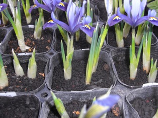 背の高さが10センチくらいのミニアイリスです。何もかもがコンパクト、でもしっかりアイリスです。ミニアイリスやクロッカス、スノードロップのような小球根は、群生しているようにかためて植えると自然ぽくてよいですね。春らしいお花がいくつか入荷しました。ミニアイリス(¥210)、セラスチューム(¥105)、芝桜(¥168)、山シャクヤクの苗(¥1480)、ライラックの苗木品種はミショルブッチャー(¥2520)など。