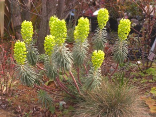 春いちばんに葉とも花ともいえないライム色に輝く咲き姿が、独特です。シルバーの葉は常緑で、こぼれ種でもよく増える、とても丈夫なウルフェニー君。