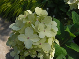さて、写真見てください。 この真ん中にピンクのポチがついてかわいいのは、ノリウツギか、ライムライトか不明です。