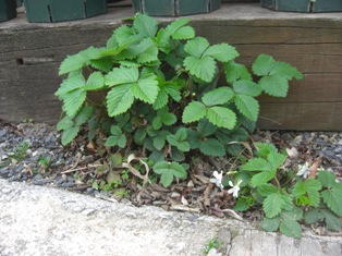 バラの鉢が並べてある枕木の下の、砂利が敷いてあるわずかな場所、こぼれ種が飛んできて、居心地良いらしく、いろんな種類の植物が根づいています。