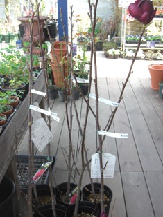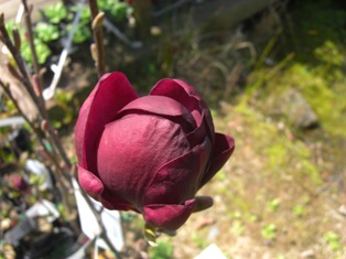 秋にポットの苗木で入荷した、モクレン・ジェニーという品種。花芽はまだ少なく、どんな花が咲くのか楽しみにしていましたが、期待を裏切らないかっこいい花が咲きました。2011年のドイツの国際園芸見本市・花木部門で賞を受賞した新しいモクレンで、花の形がチューリップ形のカップ咲きで、ワンレッドのダークカラーです。苗木で4500円とちょっと高価なモクレンですが、これからが楽しみな株です。