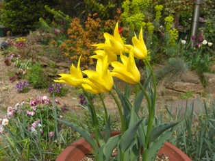 混じりけのない黄色一色のユリ咲きチューリップ。↑