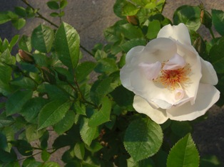 純白の半八重の花弁に、美しい赤のしべ。早咲きの品種です。
