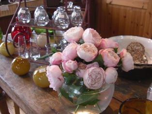 マダムピエールオジェがたくさんさいたので、丸いフラワーベースにいけてみました。