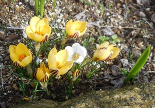 今朝起きたら思いがけず、一面うっすら雪化粧。昼すぎて、雪もすっかり消えて、庭を歩くとひっそりとクロッカスが咲いていました。