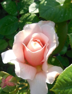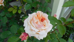 ジェントリーウィーブスです。純白のお花のイメージがありましたが、実際のお花はほんのりアプリコット色が混ざっています。コマツガーデンさんに聞いたところ、本来は白のお花だそうですが、温度によって、ピンク~アプリコット色にもなるとのこと。今回咲いたお花はまさにその通りでした。白のお花なのに、予想外に赤い蕾が付いたので、行く末を見守っておりましたが、小ぶりのかわいい花です。
