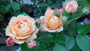 バラがいつもより早く満開です。今年お店に初登場の、デルバール社のバラ・ラ・ドルチェビータです。写真で見ていたより、なんとも優しい温かい色でした。蕾の付き方も優等生です。