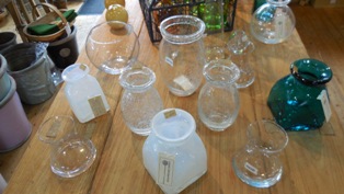 お庭で咲いた花を、ちょこっといけて飾るのにちょうどよいサイズのガラスいろいろです。梅雨に入って雨の日も多く、お庭に出る時間が少しずつ少なくなってくる頃は、朝一番でお庭を一周して、きれいな葉っぱやお花を摘んでお家の中で楽しむとよいですね。