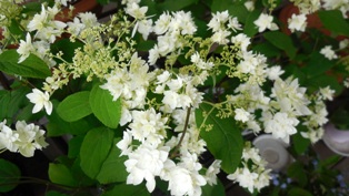繊細な白の八重咲きのアジサイ、スターバーストという品種。アナベルの八重咲き種ともいわれますが、線が細く、どちらかというと雰囲気は山アジサイの感じです。