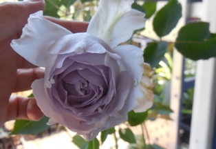 朝夕の低温のおかげか、繊細なバラ・ルシファーにきれいなうす紫色の花が2つ咲きました。