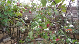 雨の日は石がキレイ。石壁にスノーグースとアロニアの赤い実が良く似合います。