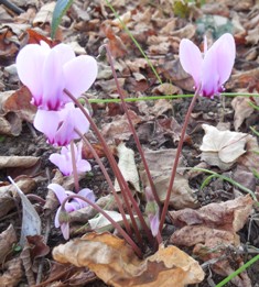 お店の庭の一番大きな木・カツラの木の下で。大きな木の下は、葉っぱで雨がかからないので乾燥しているし、掘ってみると根っこがごつごつしていてなかなか花いっぱいの植物には厳しい場所ですが、そんなところが一番のお気に入りの原種シクラメンです。今咲いているのは秋咲きのヘデリフォリウムという品種。毎年同じ時期に落ち葉の上で咲いています。目立たないですが、お店に来られた時は探してみてください。お花が咲いているポット苗もあるヨ!
