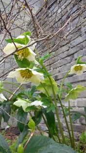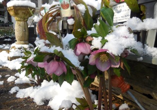 かわいいピンクのクリスマスローズ。これはこぼれ種から咲いた株です。通路の脇に落ち葉と一緒に種が飛んできて、去年から花を咲かせるようになりました。