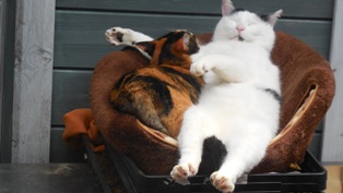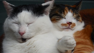 三人家族。左奥がミケ母さん、茶白がその子供。白黒の通称白ちゃんはお店に流れ着いたミケの友達かな…。茶白のお父さん説もありますが定かではありません。