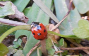 1月の天気ではありません。今日は…。3月の春の日差しが降り注いでおります。おかしい…。うっかり出番を間違えてしまったテントウムシに、ばったり遭遇。