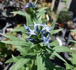 淡いブルーの花が咲きます。夏は半日陰など涼しいところで乾燥させすぎないようにするとよいです。