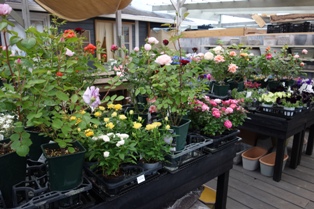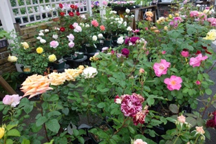 今日は久しぶりにポツポツ雨降りです。早咲き品種のバラがたくさん咲いて、お店の屋根の下に移動してみたら、いつもより売り場が華やかになりました。