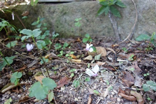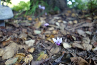 お店の庭に原種シクラメン・ヘデリフォリウムが咲いています。