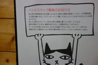 春と秋の季節限定のお仕事になります。販売と植物の管理で1日3〜4時間程度。土日祝日働ける方、ラブリーガーデンで働いてみたいという方おられましたらお尋ねください。