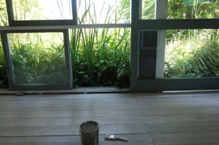 夏休みの仕事の一つ。デッキの上のいろいろを移動してとりあえず白く塗りました。暑くてなかなか動けません。少しづつです。