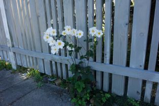 秋明菊が野性的にフェンスの外の隙間に咲いています。一度も水をあげたことがない場所。